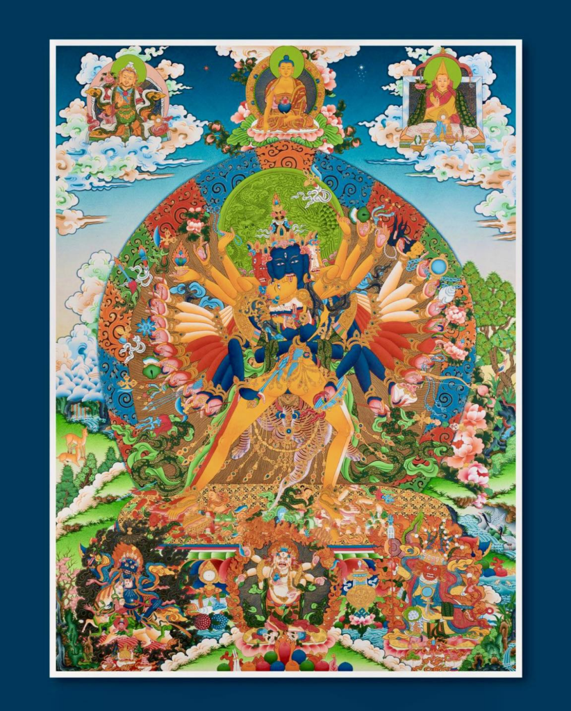 他的24只手中,有兩只深藍色的手結「金剛吽迦羅印」抱明菲,並持鈴杵以表方法與智慧雙成,其餘手伸向兩邊,手中各持不同器物,都含有宗教寓意,但主要表現的是主尊的智慧,以及大憤怒、大無畏之威力。